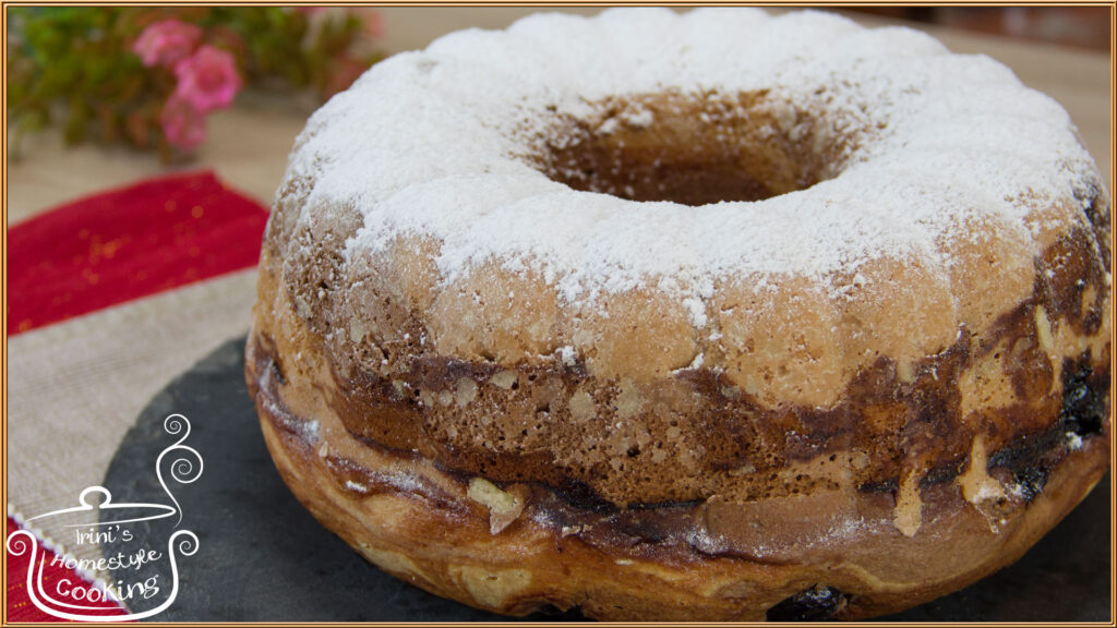 - Όταν ψηθεί ανοίξτε λίγο το φούρνο και αφήστε μέσα το κέικ για 30 λεπτά. Βγάλτε το απ’ τη φόρμα μόλις κρυώσει λίγο. Πασπαλίστε με λίγη άχνη απ’ πάνω.