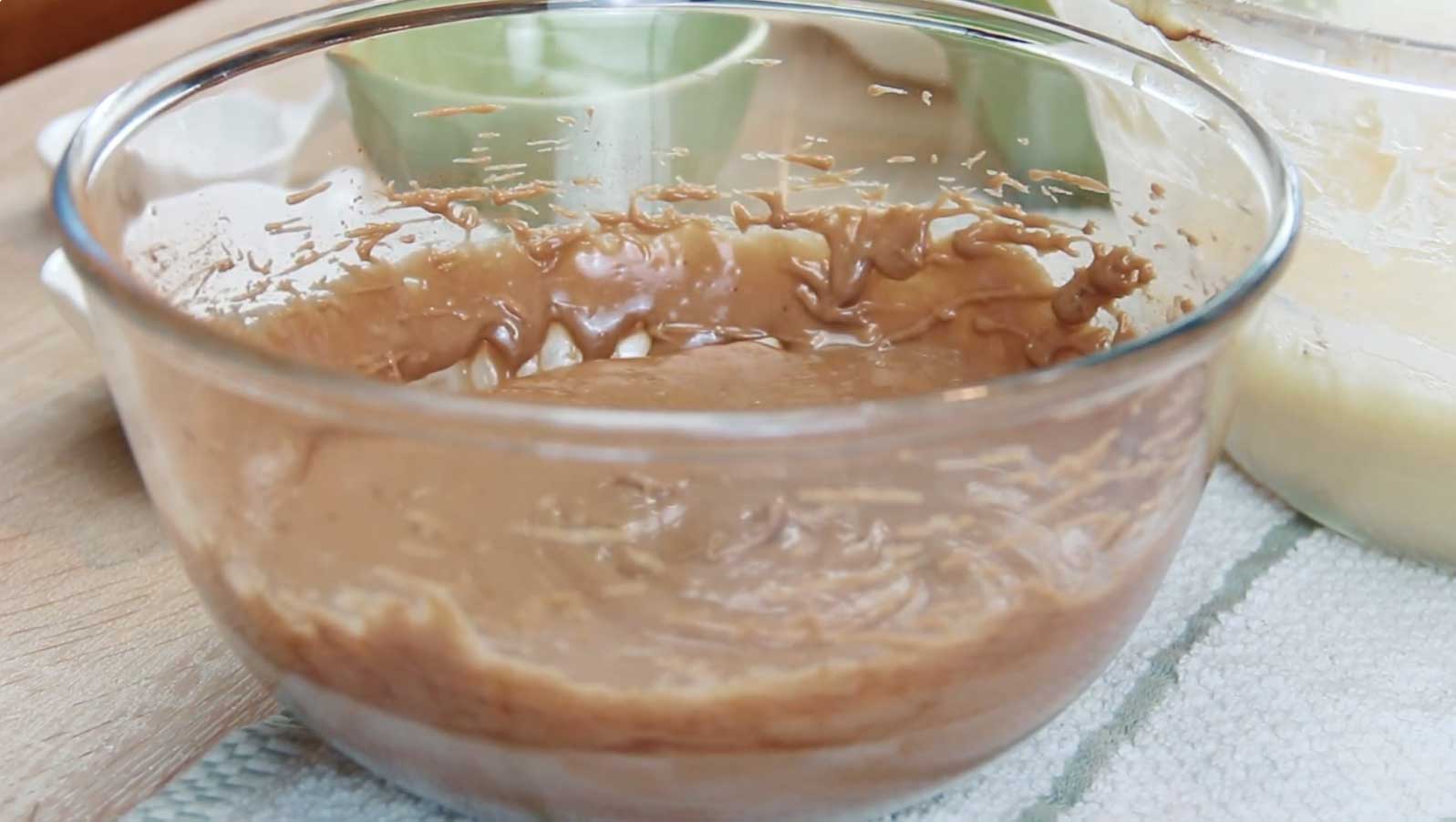 - Χωρίστε στη μέση το χυλό και προσθέστε στο ένα την βανίλια με το έξτρα αλεύρι και στ άλλο μισό το κακάο.