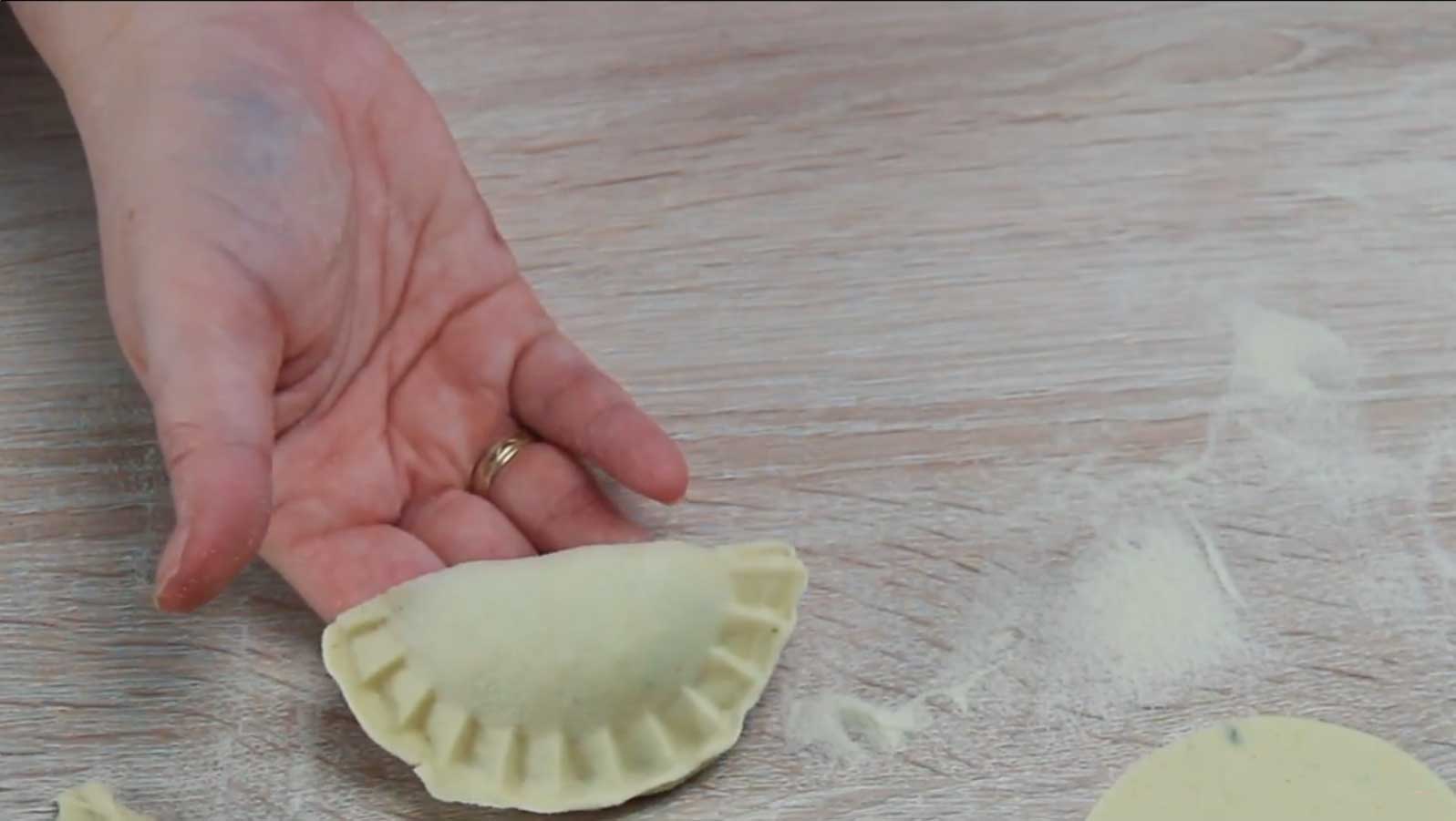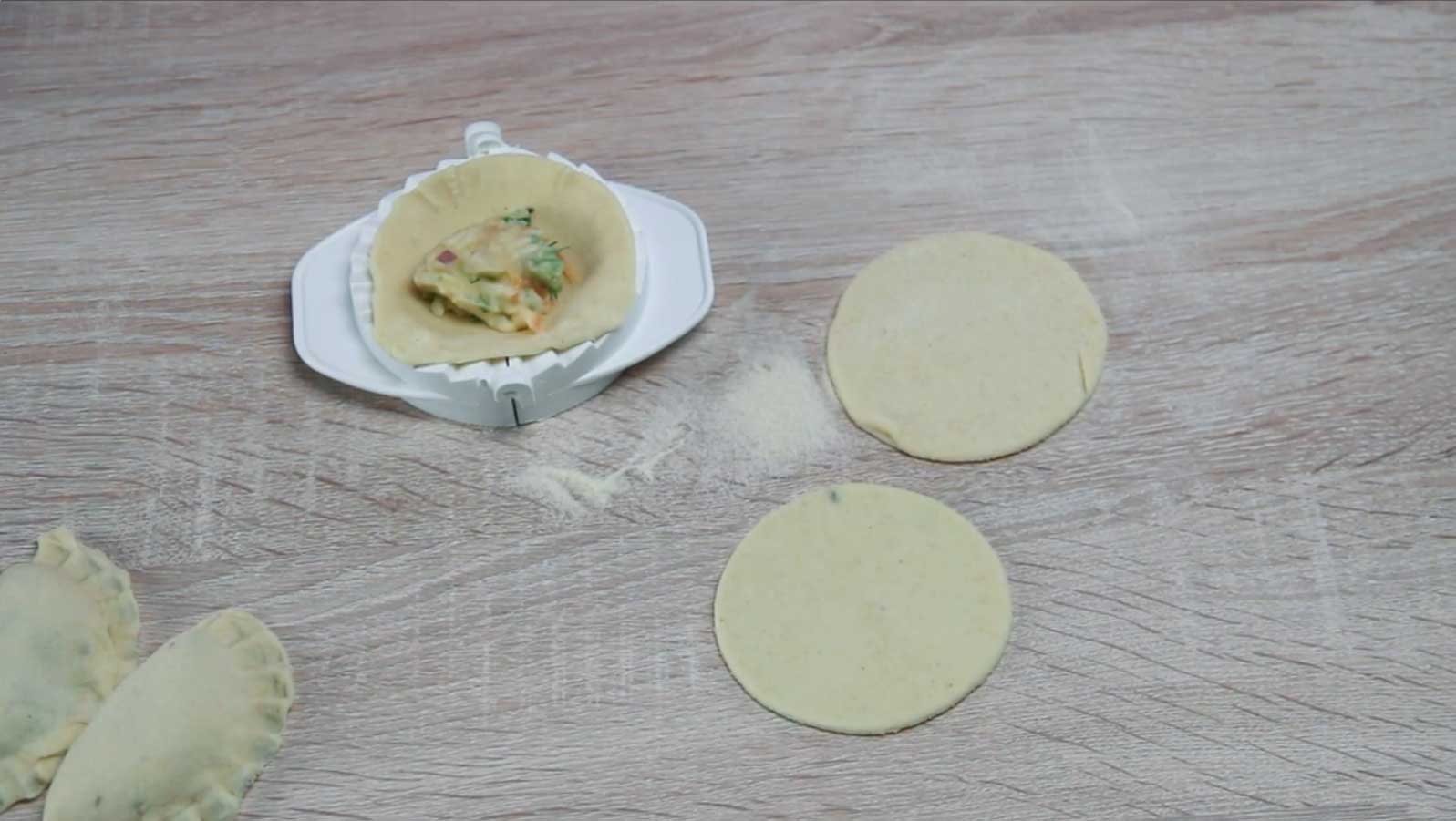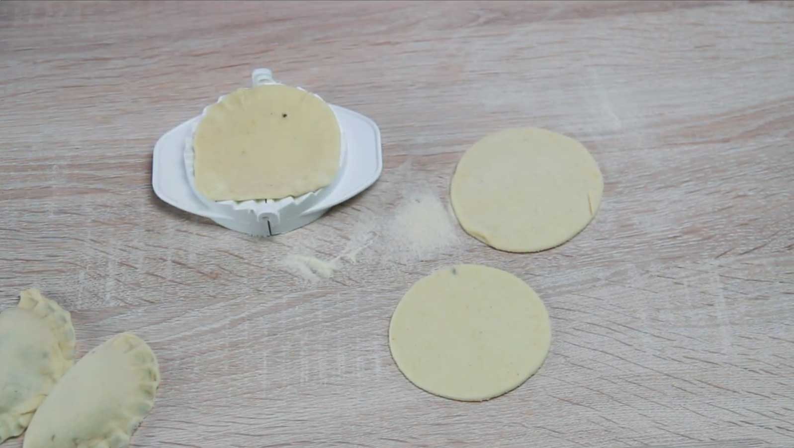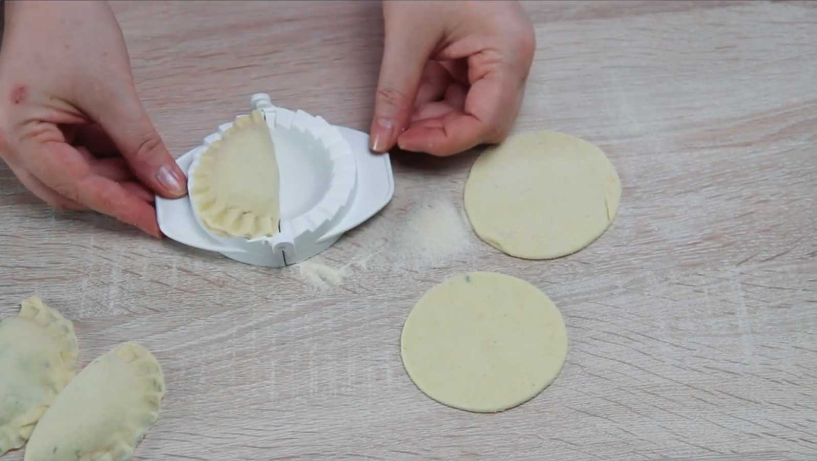 - Ανοίξτε τη ζύμη σε φύλλο πάχους 2–3 χιλιοστών και κόψτε κύκλους διαμέτρου περίπου 10 εκ., χρησιμοποιώντας κουπ-πατ ή ένα ποτήρι. Τοποθετήστε μια γεμάτη κουταλιά της σούπας γέμιση στο κέντρο κάθε κύκλου και διπλώστε τη ζύμη σε σχήμα μισοφέγγαρο. Πιέστε καλά τις άκρες για να κολλήσουν, ώστε να μην ανοίξουν κατά το ψήσιμο.
