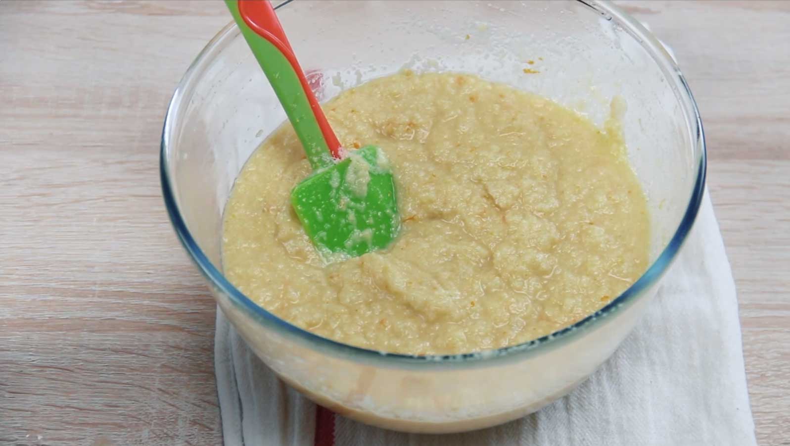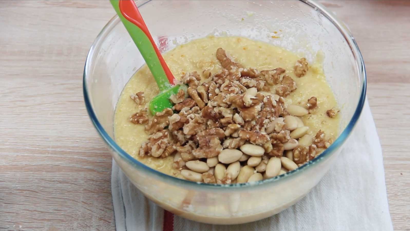 - Χτυπήστε το βούτυρο καρύδας με την ζάχαρη να αφρατέψει, προσθέστε το μήλο, το γάλα, το ξύσμα, συνεχίστε λίγο το ανακάτεμα. Ρίξτε το ξύσμα, το σιμιγδάλι, το μπέικιν, την σόδα και ανακατέψτε λίγο ακόμα. Τέλος βάλτε τους ξηρούς καρπούς και ανακατέψτε απαλά.