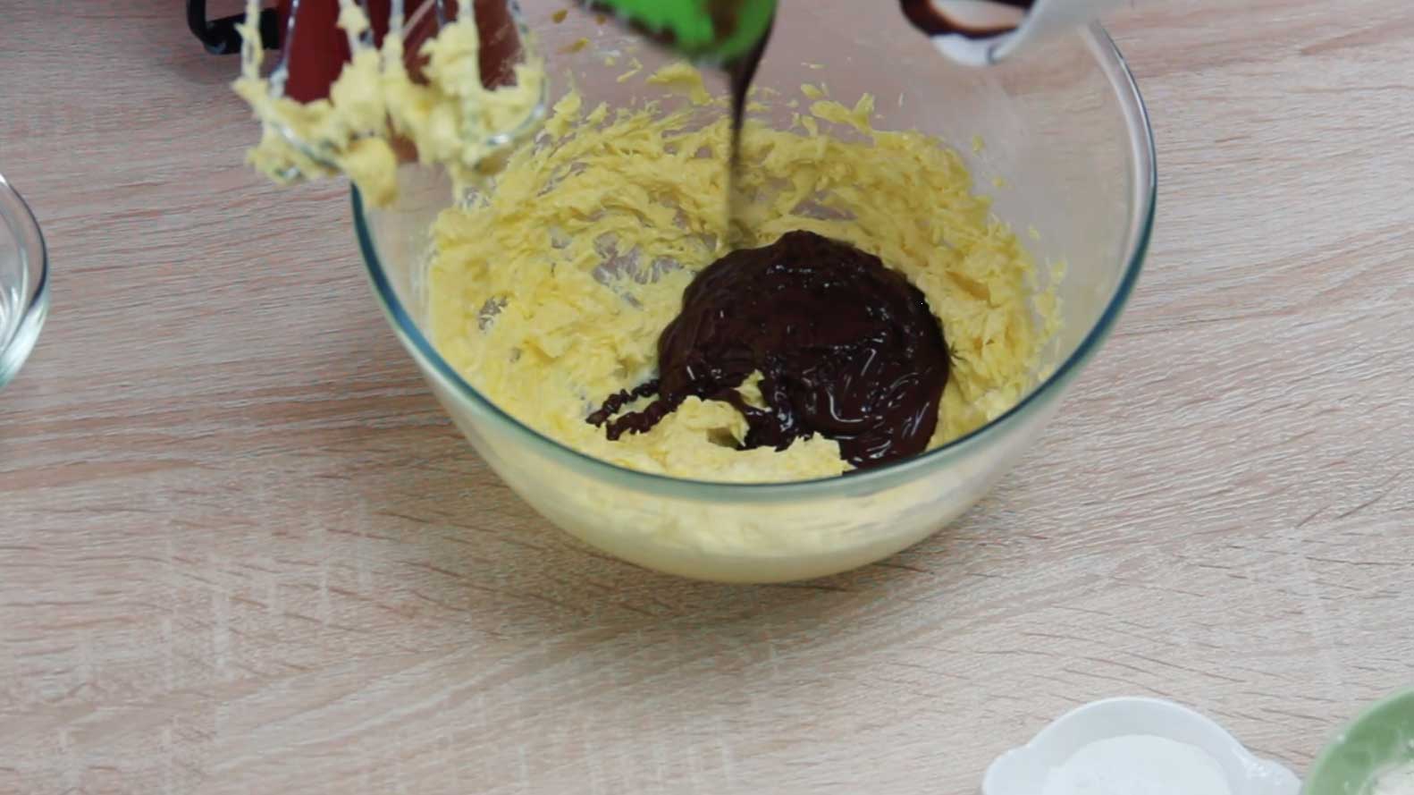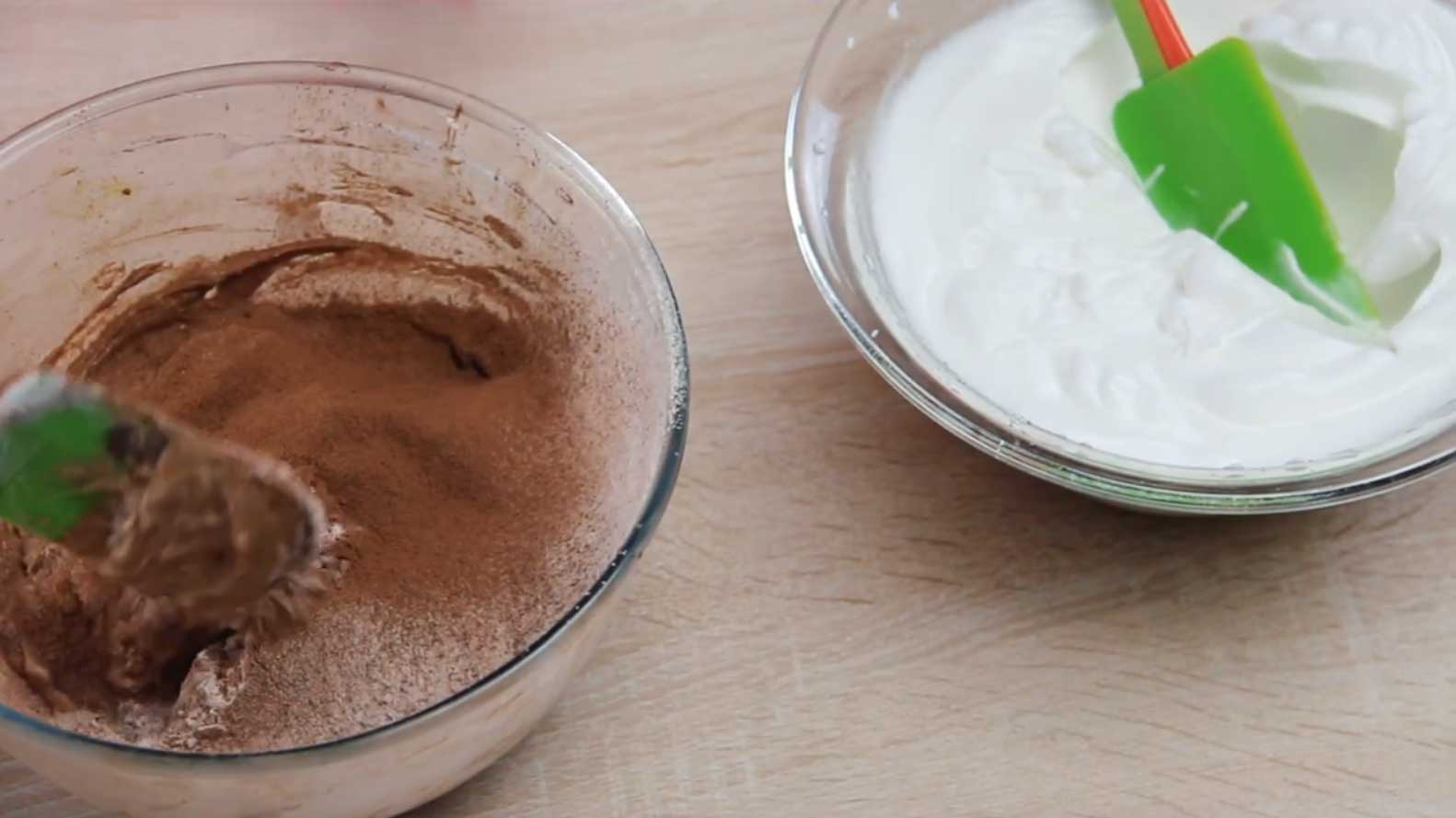 Βάλτε μια μικρή ποσότητα μαρέγκας μέσα στο μείγμα βουτύρου και ανακατέψτε απαλά με μια μαρίζ. Προσθέστε το αλεύρι, το κακάο και το μπέικιν πάουντερ, ανακατεύοντας μέχρι να ενσωματωθούν πλήρως.