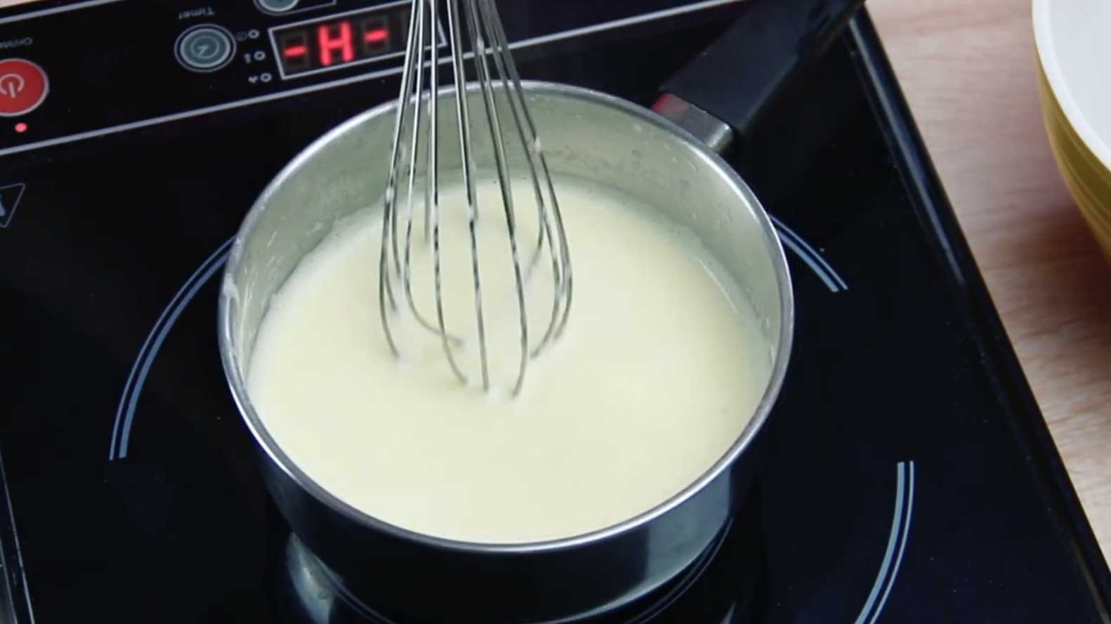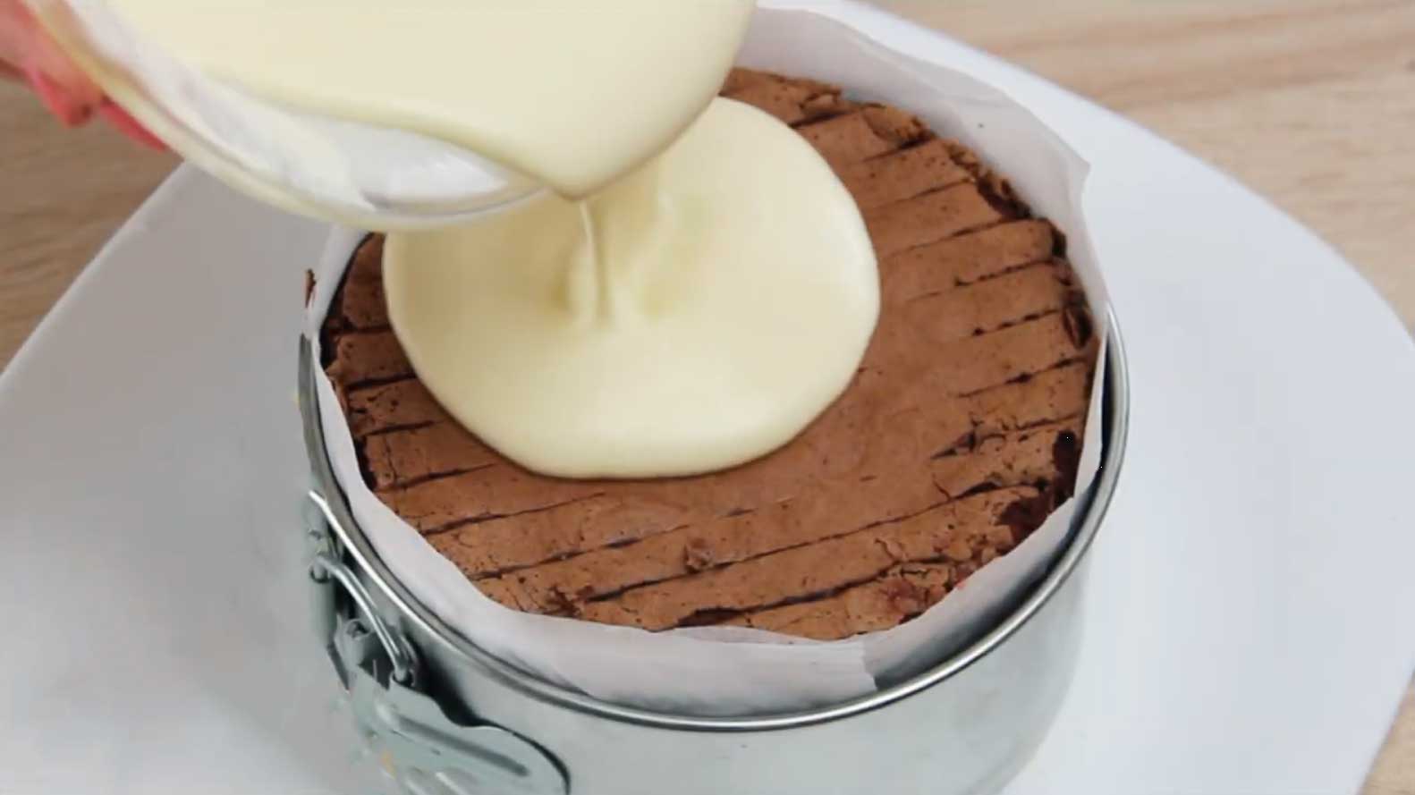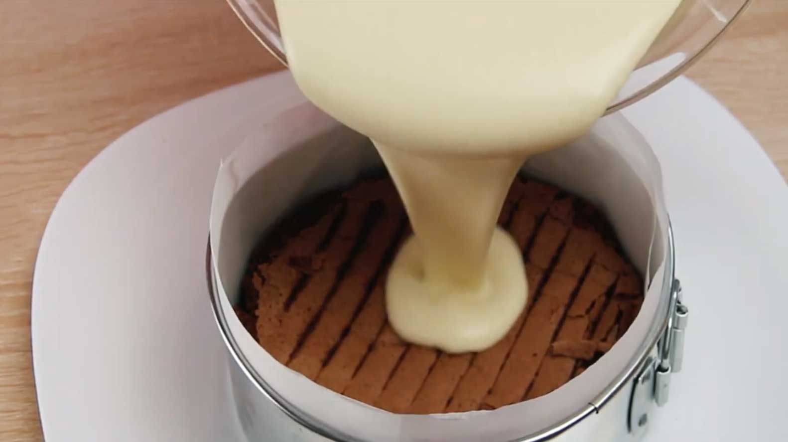 Προσθέστε τη ζελατίνη και τη λευκή κουβερτούρα. Αφήστε το σε μέτρια θερμοκρασία, ανακατεύοντας συνεχώς, μέχρι να πήξει.