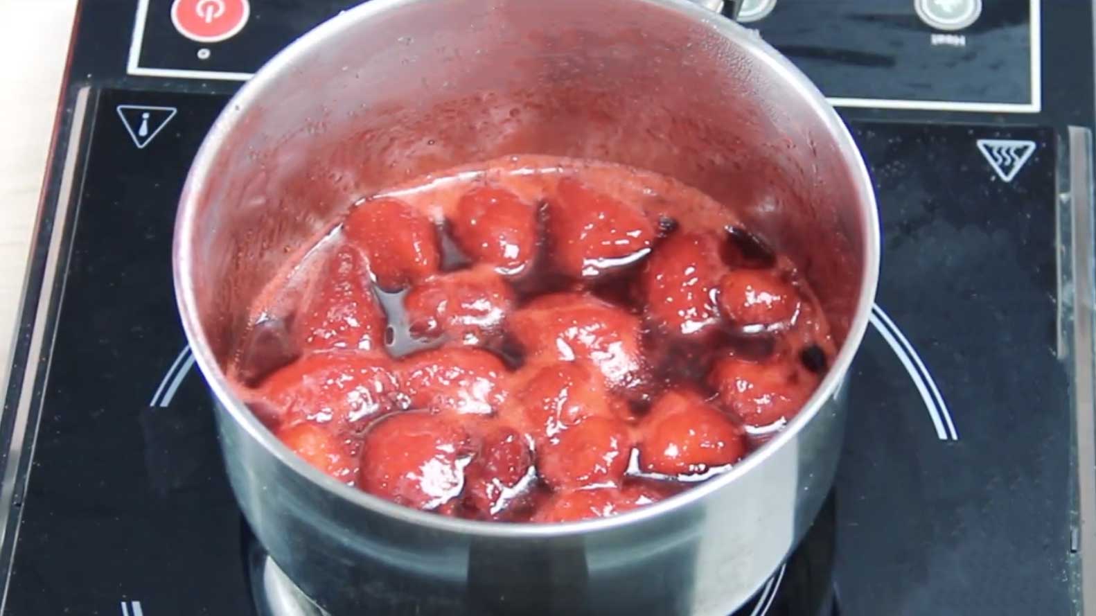 • Σως φράουλα: Σε ένα κατσαρολάκι βάλτε τις φράουλες με τη ζάχαρη και την πηκτίνη και αφήστε να βράσουν για 8 λεπτά.