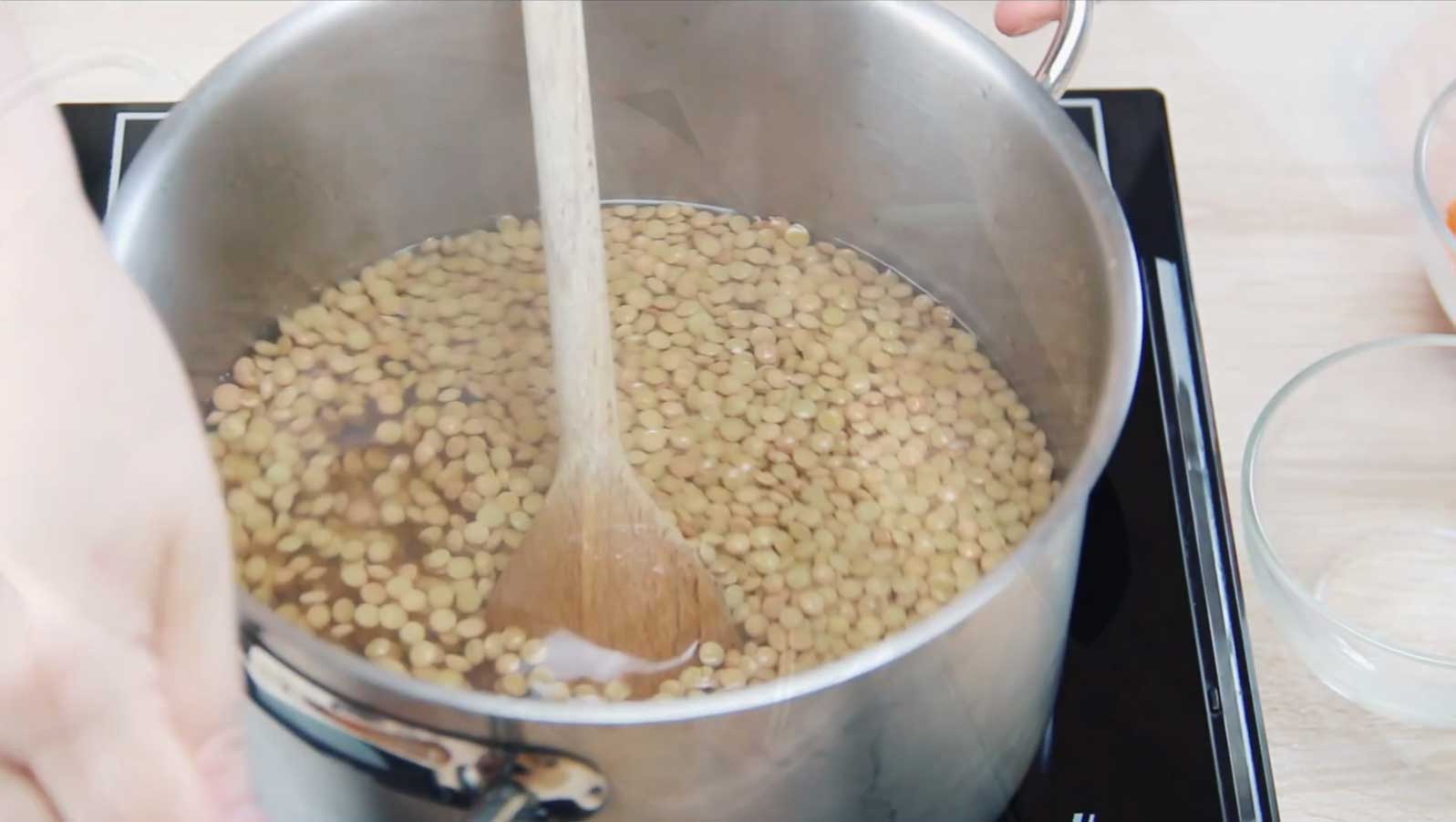 - Βράστε χωριστά τις φακές για 5 λεπτά. σουρώστε και ξεπλύνετε τις λίγο.