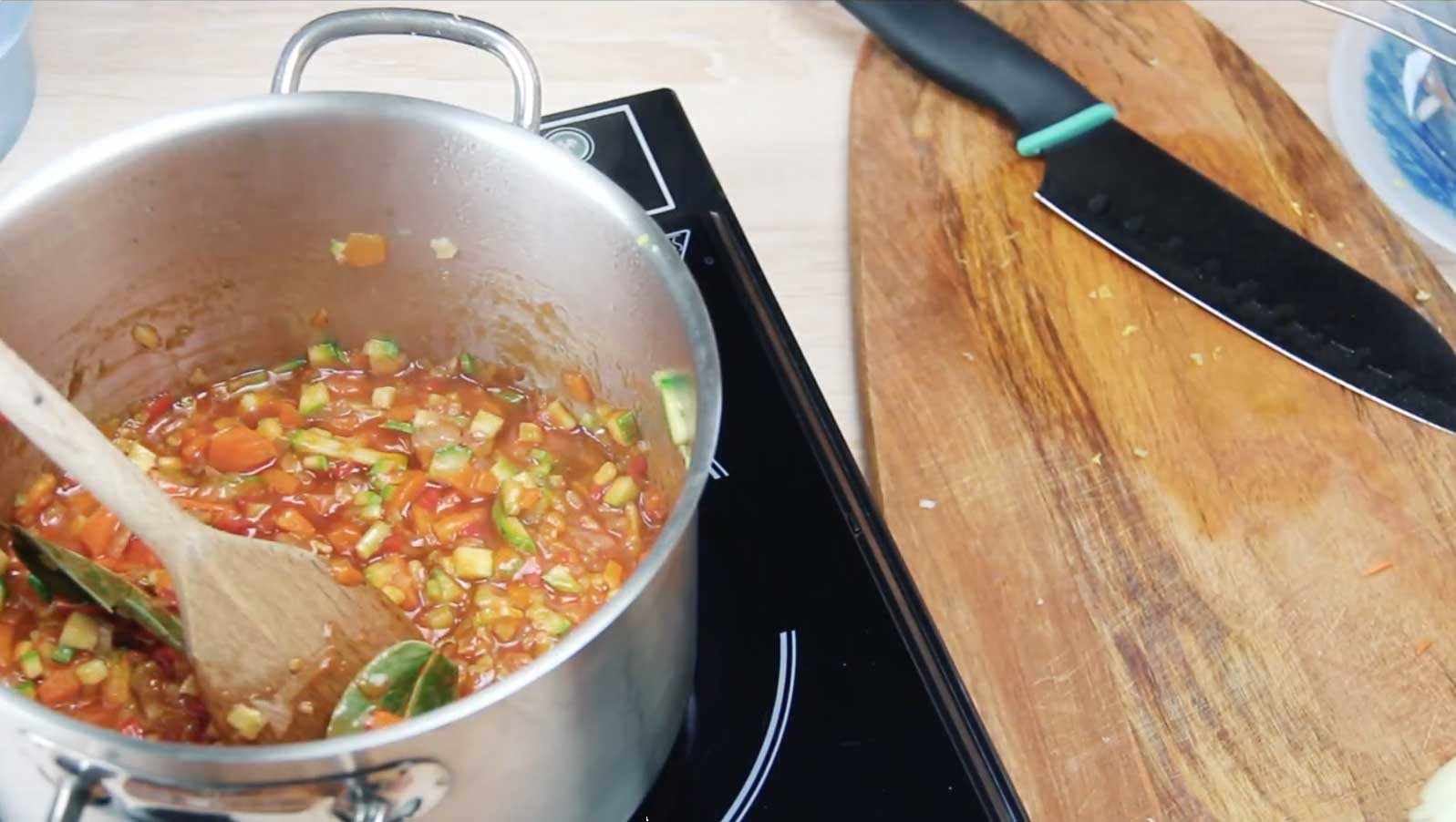 - Ψιλοκόψτε τα λαχανικά και σοτάρετε τα σε ελαιόλαδο.