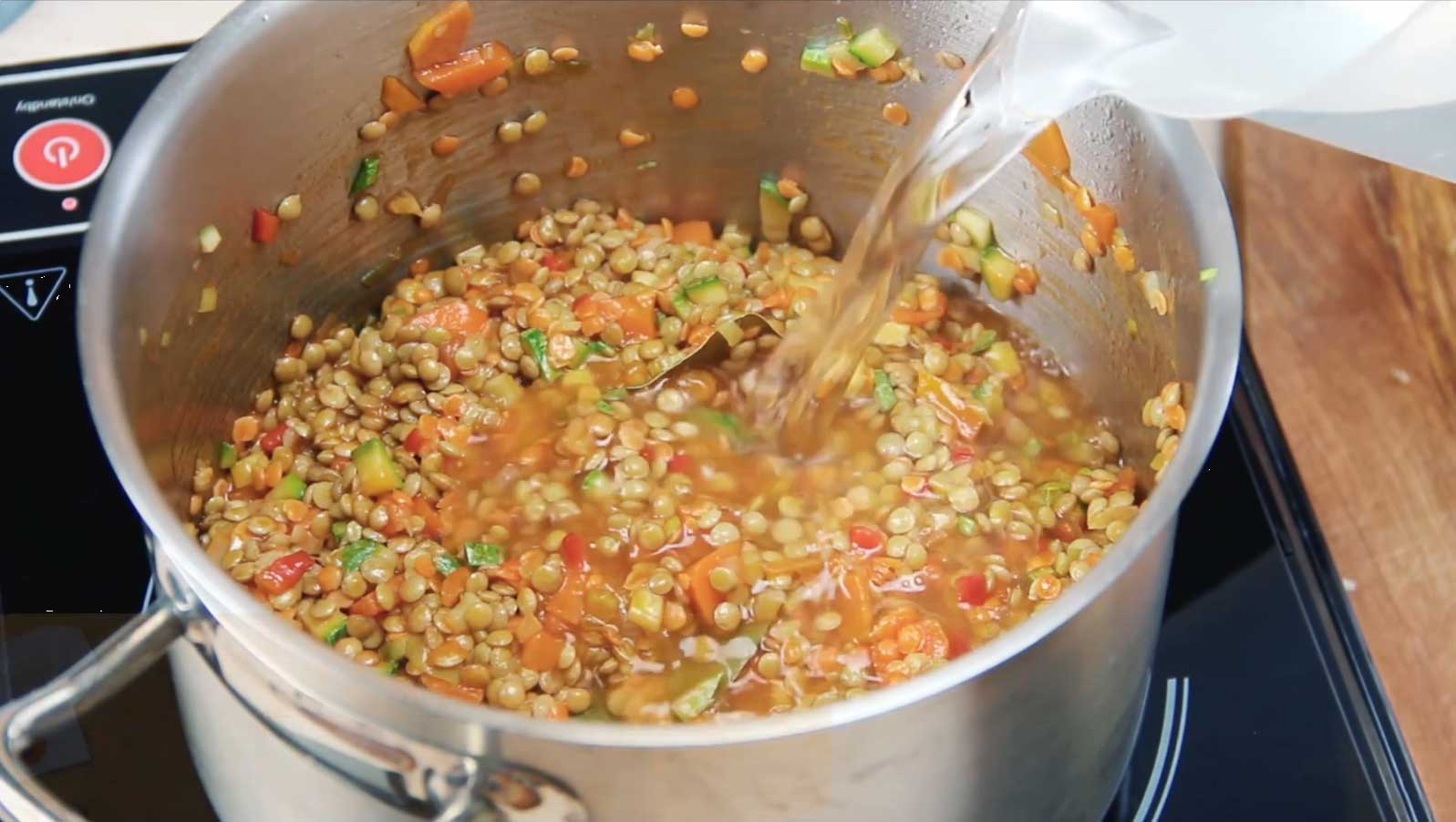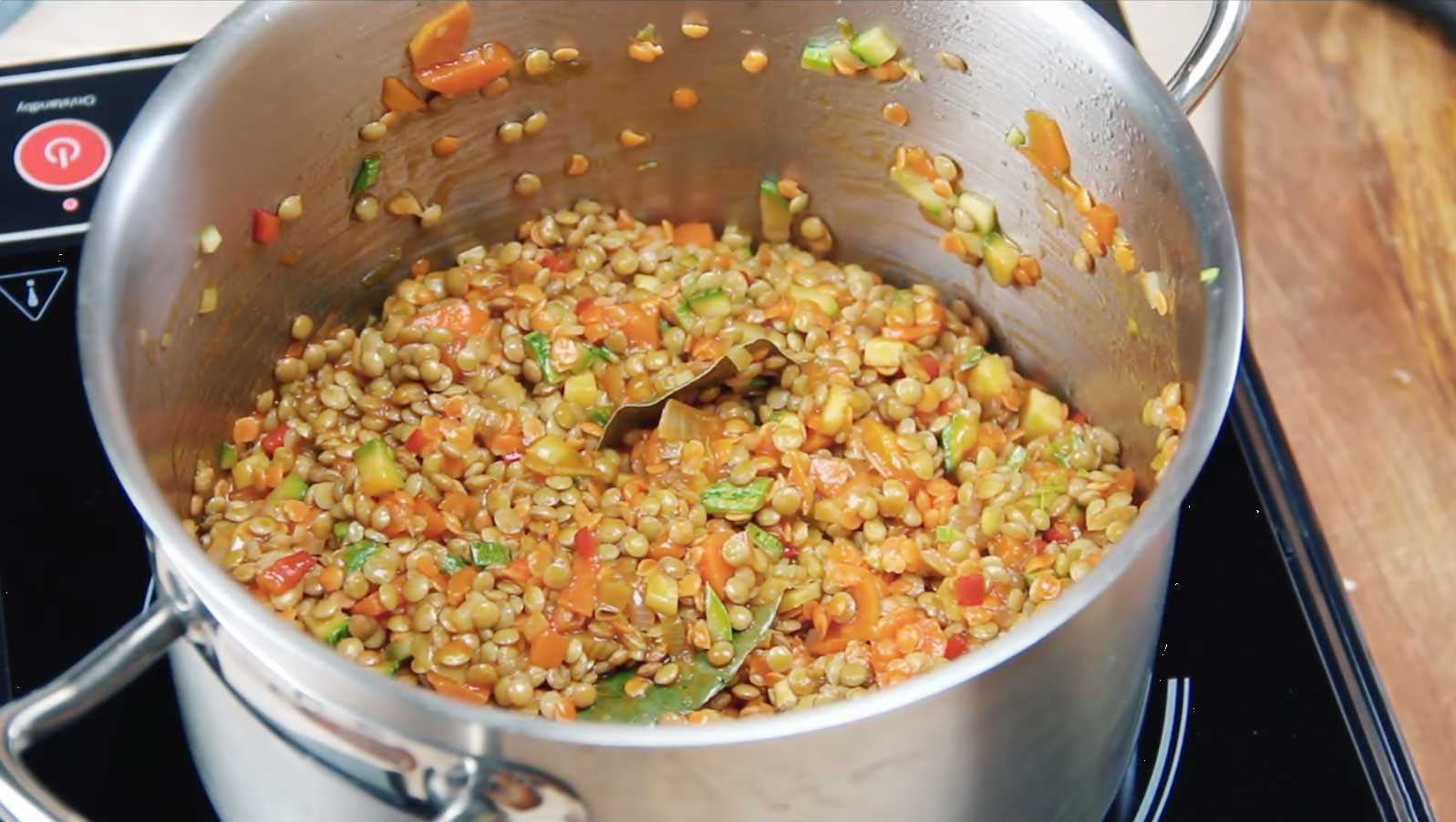 - Προσθέστε τις φακές και όλα τα υπόλοιπα υλικά. Ρίξτε νερό μέχρι να καλύψετε τις φακές και αφήστε τις να βράσουν για 30 λεπτά.
