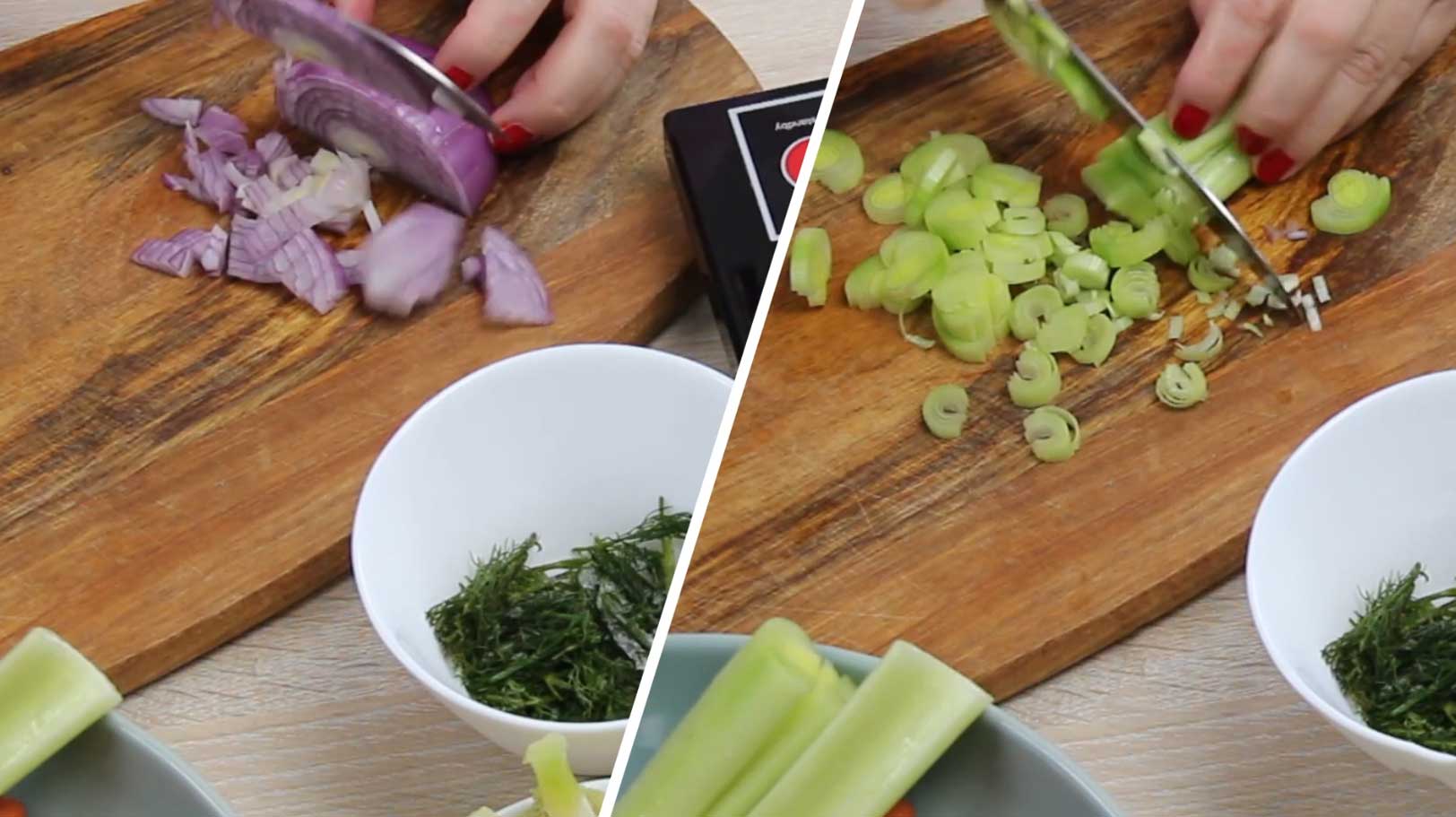 - Ψιλοκόψτε όλα τα λαχανικά, σε μια μεγάλη κατσαρόλα βάλτε το ελαιόλαδο και σοτάρετε όλα τα λαχανικά. Ρίξτε 1.700 ml νερό, το ζωμό, το αλάτι κι αφήστε το φαγητό να βράσει.